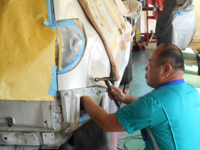 右クオーターパネル、リアバンパーに発生したダメージを修理致します。