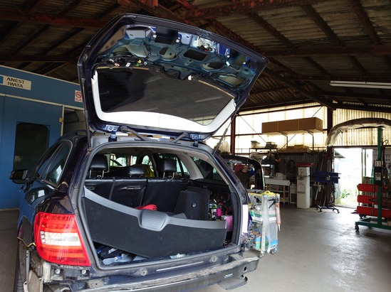 リアゲート、右クオーターパネル、リアバンパー右側の修理を行います。