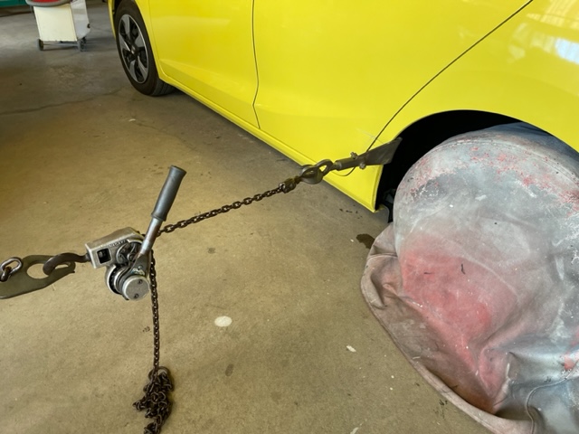 ロックピラーが車両内側に変形をおこし入っているので、チェーンブロックを使用し引き出しています。