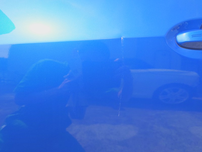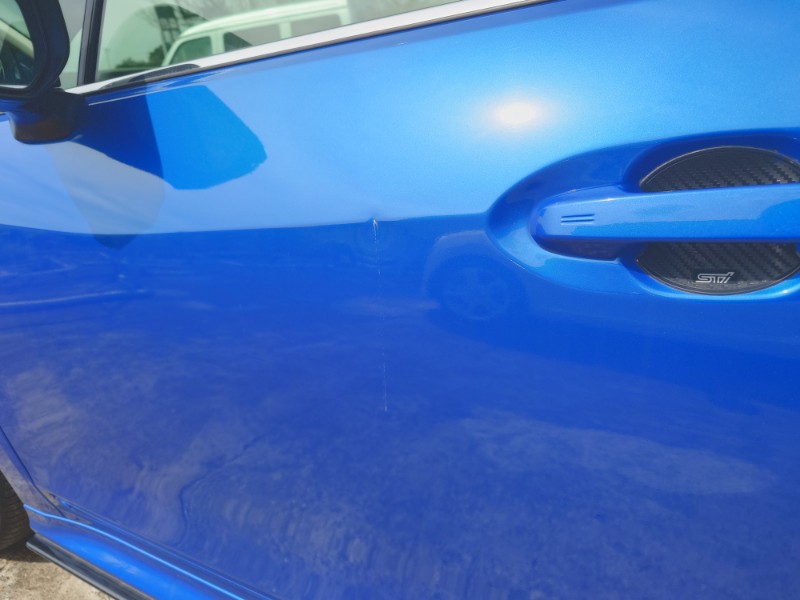 フロントドアはアウターハンドル前方に縦の線へこみを修理致します。