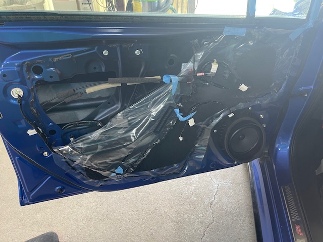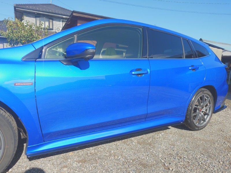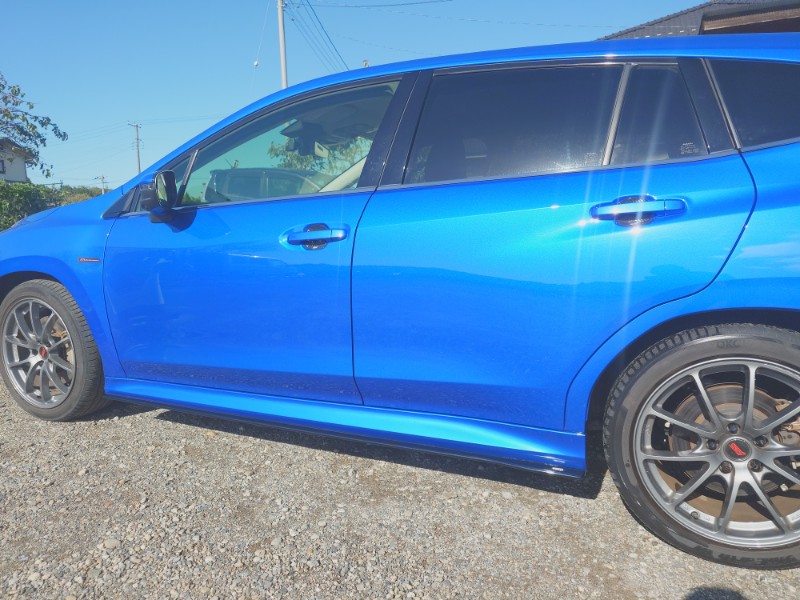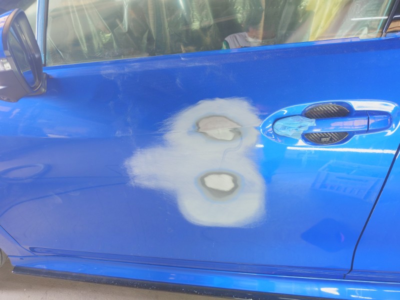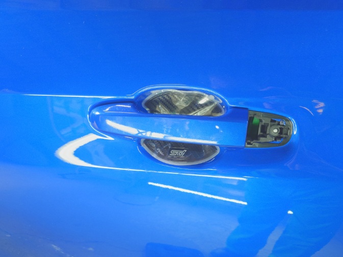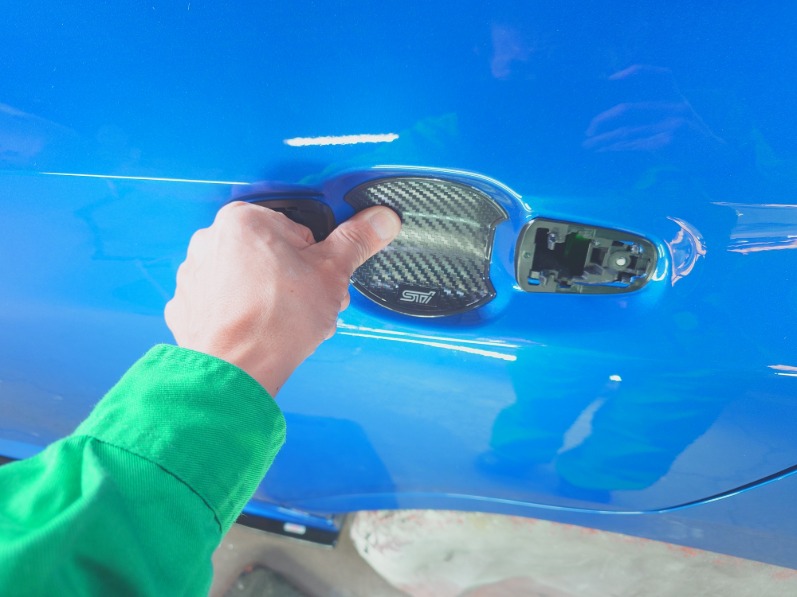 ハンドルを仮付けした状態でオプションのドアプロテクターの位置決めにかかりました、ハンドルとSTIの文字が水平になるように貼り付けます。