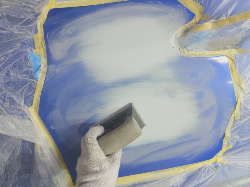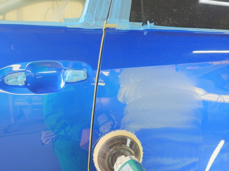 微小なゴミをペーパー研磨で平らにしてから塗装肌を整えるポリッシング作業を行っています。