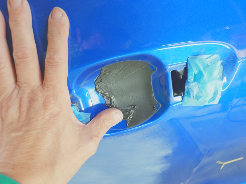 翌日にマスキングをはがし、アウターハンドルの穴などマスキングで切った部分にクリアーの筆刺しを行い後々のはがれトラブルを抑える作業を行いました。