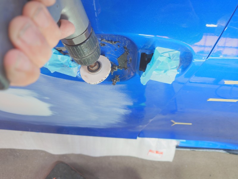 ドリルに付けたゴム製のディスクを使用して塗膜にダメージを与えないように注意しながら削り落としています。