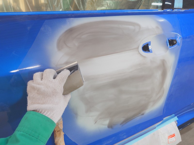 120番の中間パテを必要最小限の厚みで付けました、一度きつくシゴキ付けを行ってパテと下地を確実に密着させてから必要な厚みを付けています。