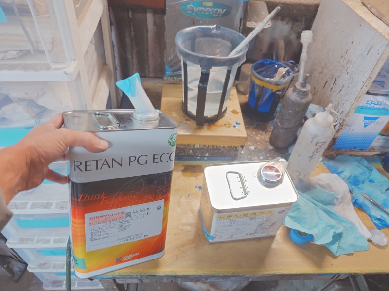 トップコートクリアーは傷が入りにくいセルフリストアリングコート指定なので関西ペイント製ダイヤモンドクリアーQ3Sをハカリを使用して正確に硬化剤、シンナーの配合を行いました。