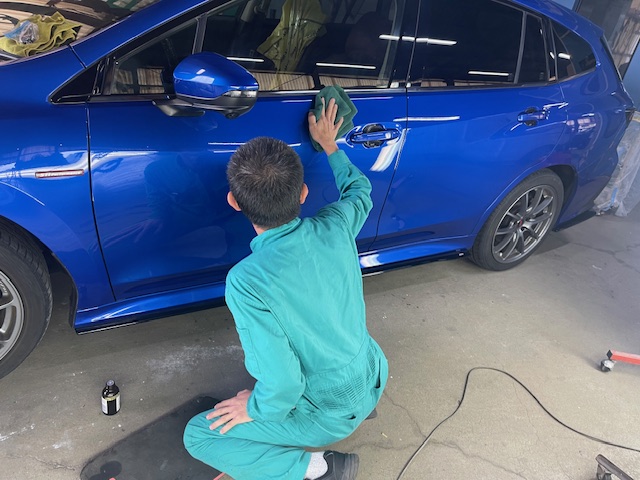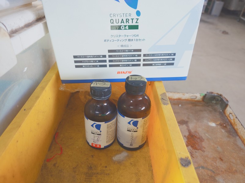 組み付け完了後に撥水ボディーコーティング、クリスタークオーツの施工を開始しました。
