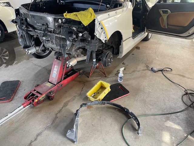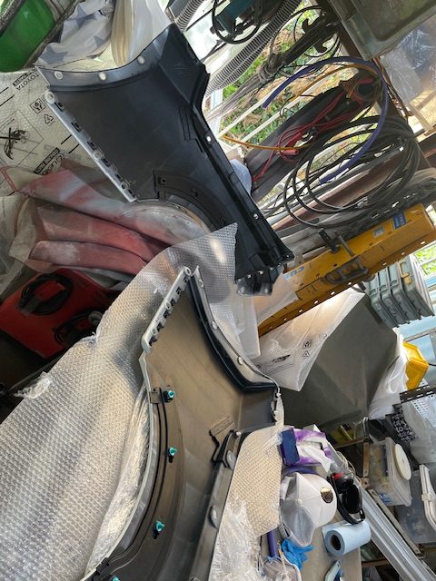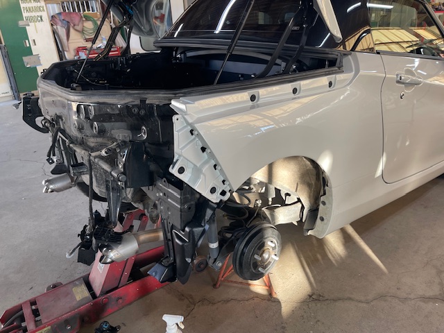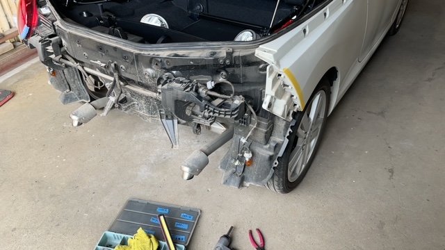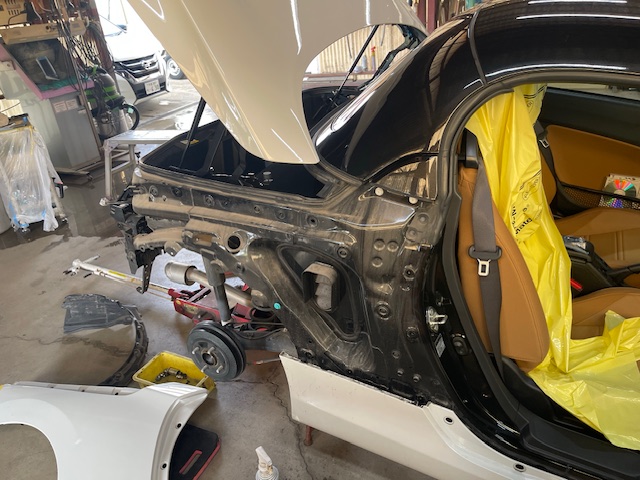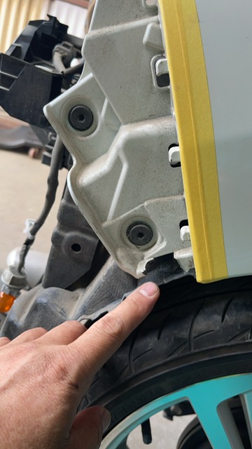 リアフェンダーの建付けが合い、新品のバンパー取り付けにかかりました。