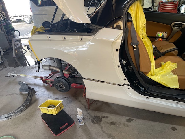分解を行った周辺部を点検中、樹脂製の右クオーターパネルに損傷がありました。