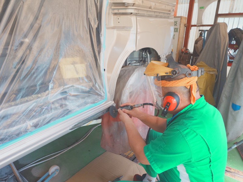 研磨作業で発生した粉と臭いが入らないようにノーポリでふさいでから損傷部の塗膜を各種サンダーを使用し塗膜剥離作業に移ります。