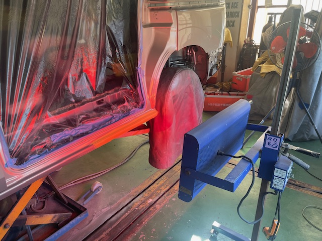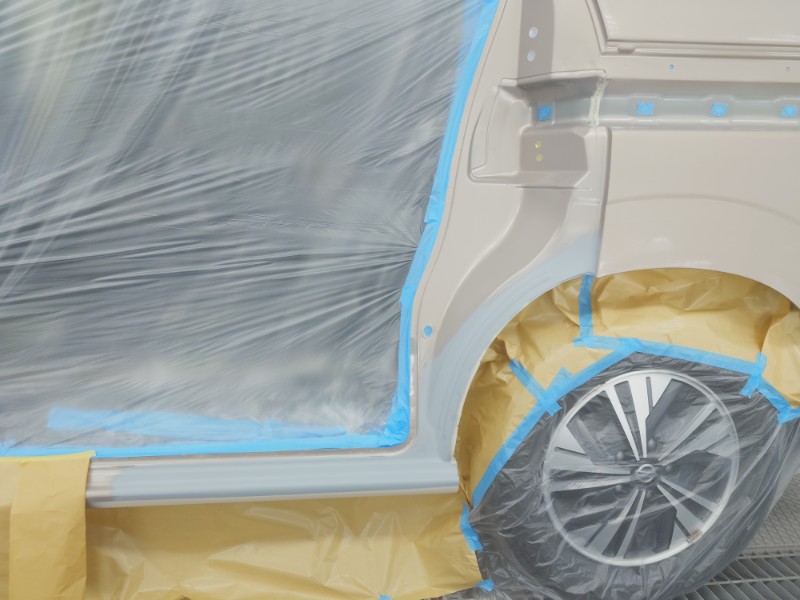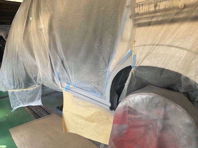サフェーサーの研磨、周辺部の足付け、ロッカーパネルのアンダーコート吹き付けを終えてマスキング作業にかかりました。