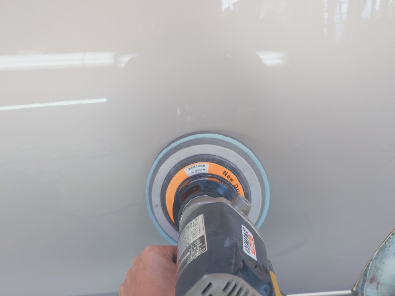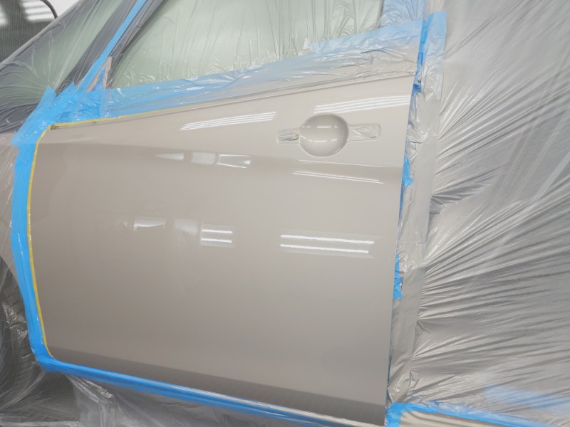塗装後、組替を行った新品ドアをボディーに組付けてからポリッシングを行い、塗装面に付着した異物を取り除き塗り肌を整えています。
