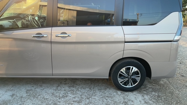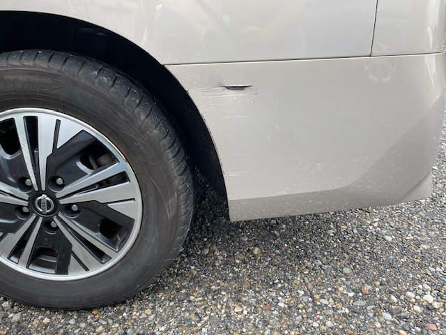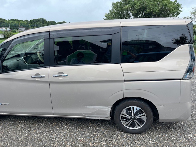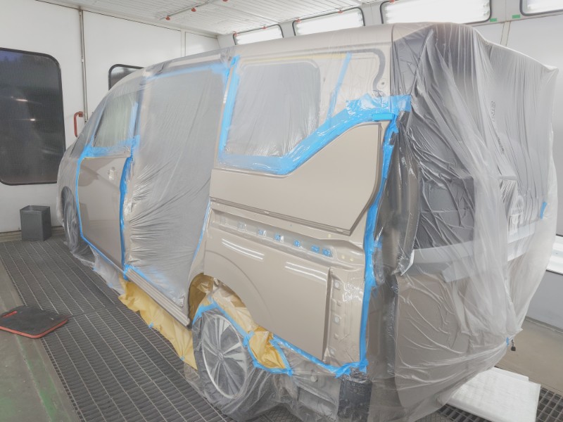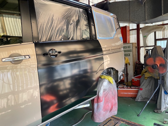 スライドドアとバンパーは新品部品に取り替えて、ロッカーパネルは板金修理を行います。