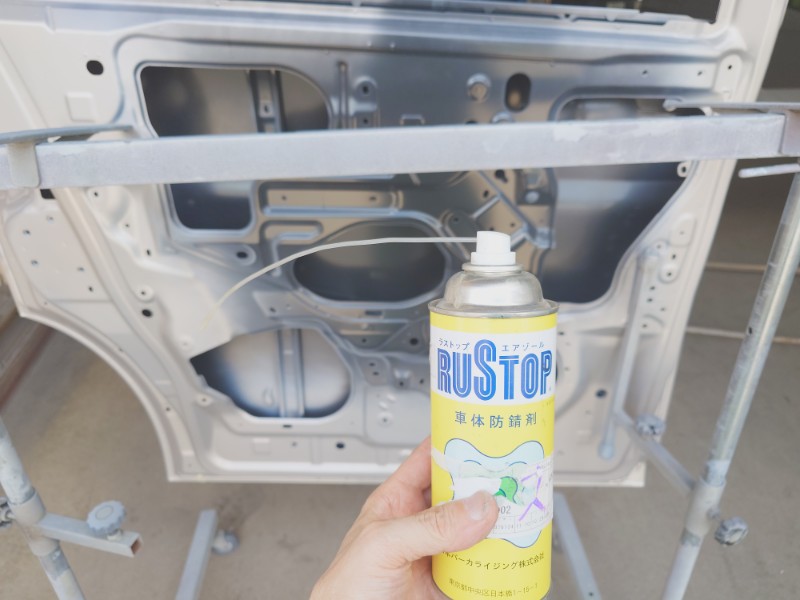 加熱硬化を行い、ブラックアウトテープを貼りつけてから防錆剤ラストップをパネル内側ヘミング部とその近辺に塗布します。