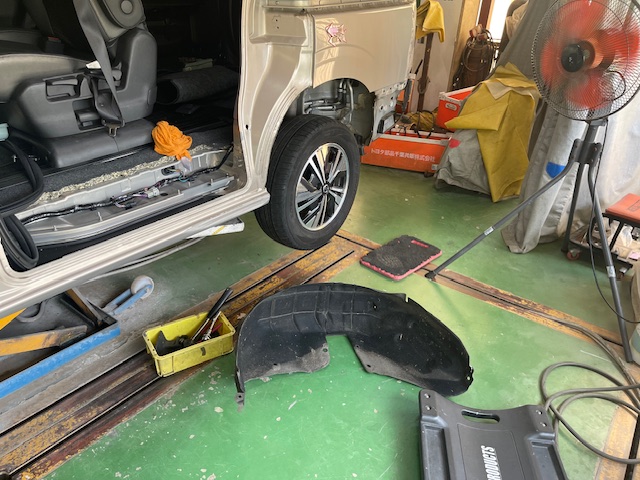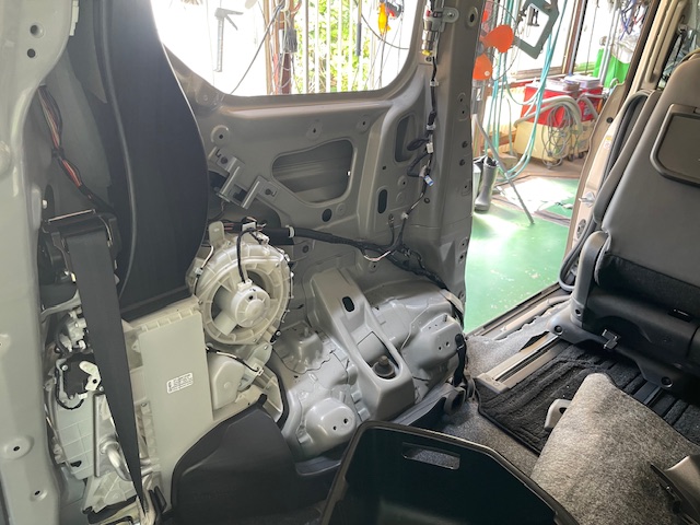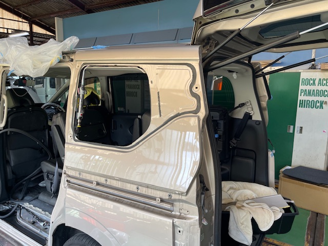 損傷を受けたスライドドアを取り外し、ロッカーパネルの修理を行う為の分解にかかりました。