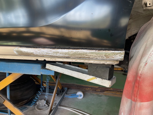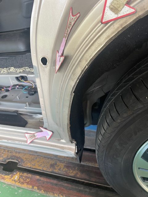 建付けの合ったスライドドアでロッカーパネルの鈑金整形を仕上げます。