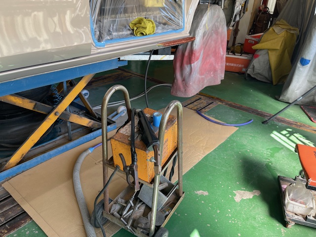 加熱と研磨を行った後にリフトで上がってる状態で中塗りアンダーコートをロッカーパネルに塗装を行います。