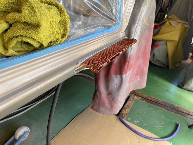 パテ作業に移り、温度管理を行いながらパテを加熱硬化させています。