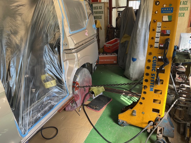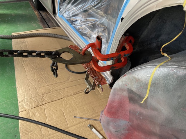 ロッカーパネルの引き作業にかかりました、数か所に分け、バランスを取りながらタワーの油圧を使用してライン状に引き出を行っています。