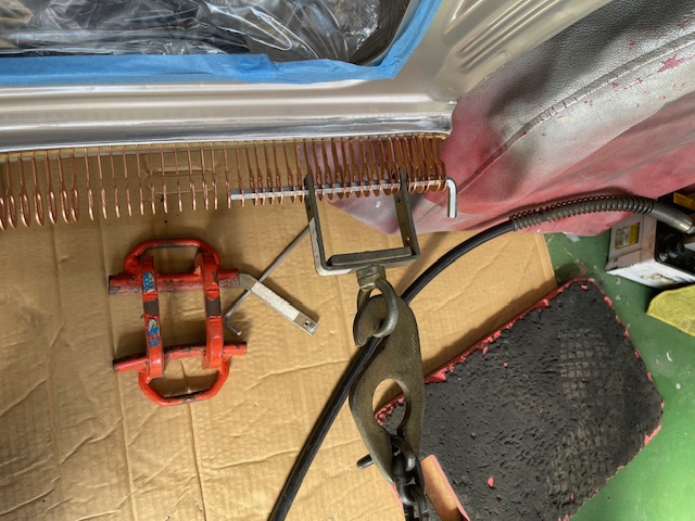 ロッカーパネルの損傷を直線的に引きだすためにスタッドのチップを熔植しています。