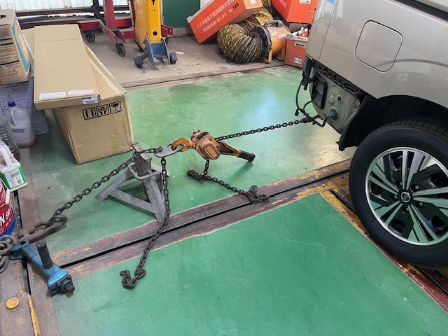 強めの引き作業を行う場合、車両が動いてしまうので、反対側をチェーンで固定しました。