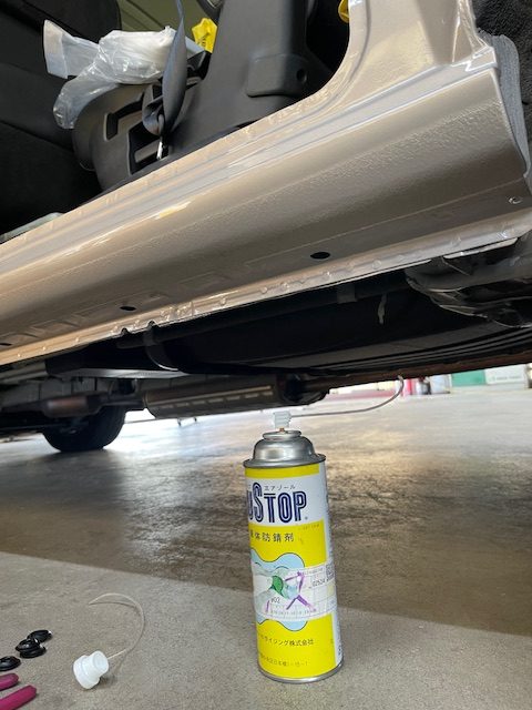 ロッカーパネルは先を曲げたノズルを使用して板金修理を行った裏面に吹き付けを行いました。