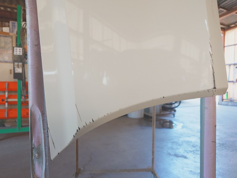 損傷部の塗膜を各種サンダーを使用してサンディングを行い鉄板面を露出させます、塗膜成分が少しでも残っているとスタッド作業時に付きが悪かったりスパークが発生する可能性があるので鉄板面は残りが無いように研ぎだしを行いました。