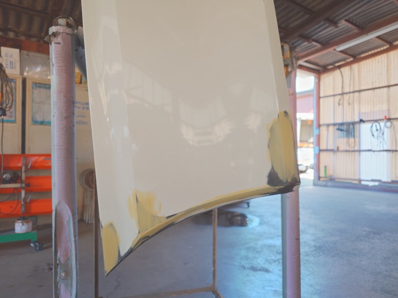 スタッドを使用して形状を整えた後にサンディングを行いスタッドあとやハンマリングのあとを削り出し、鉄板面をきれいにしてからパテ作業に移りました。