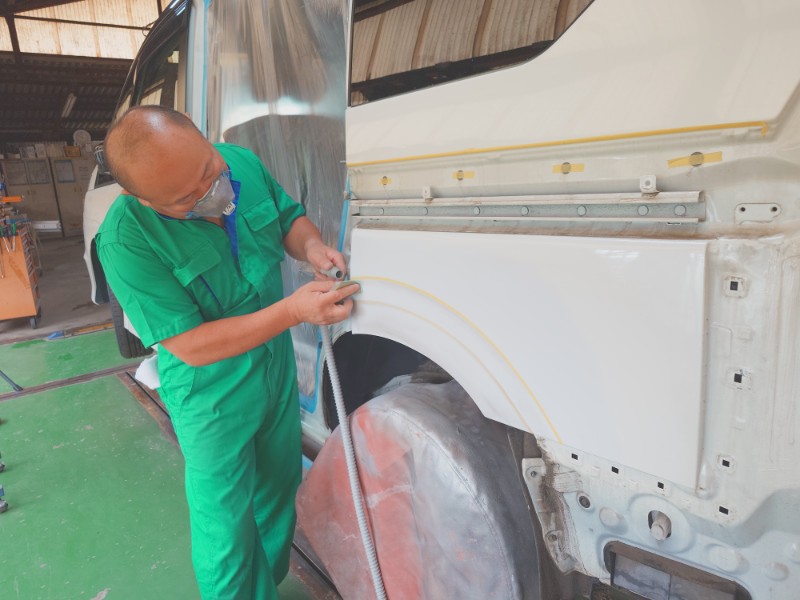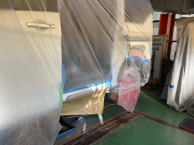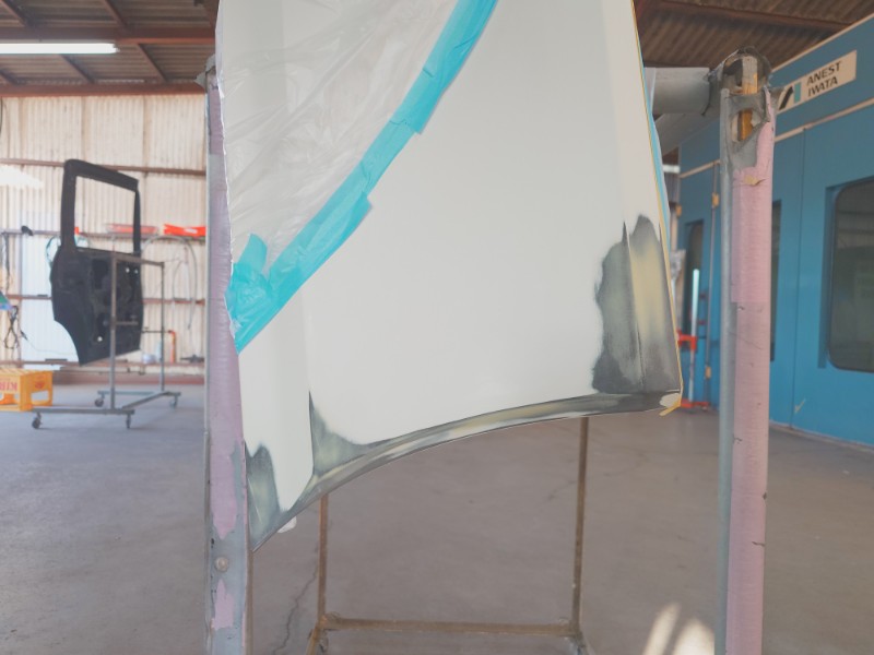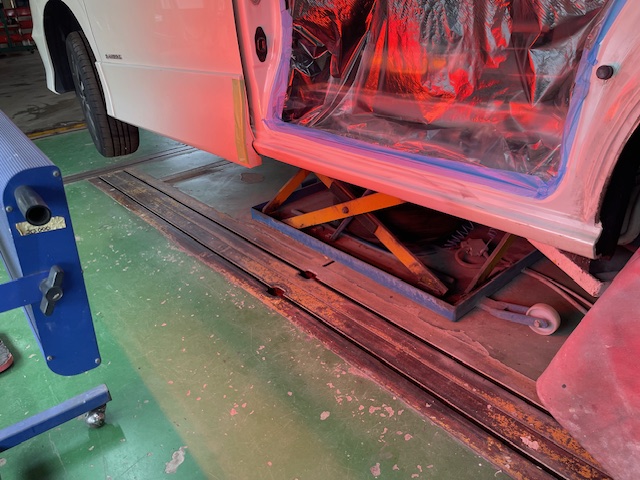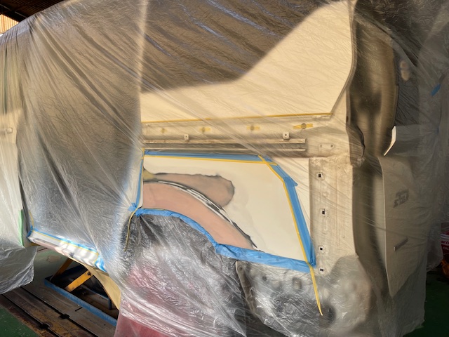 塗装部に加熱を行い硬化をさせてから足付け研磨、マスキングを終わらせて塗装準備が整いました。
