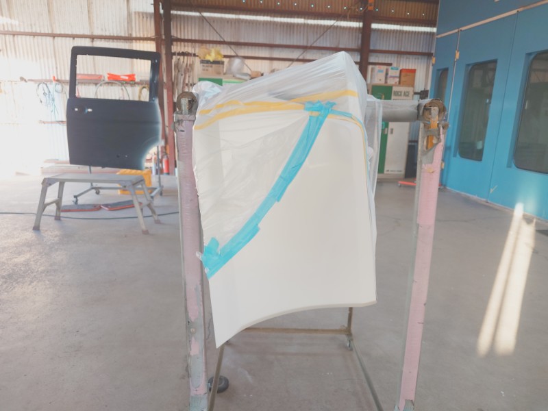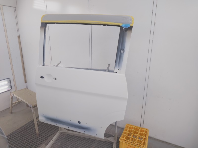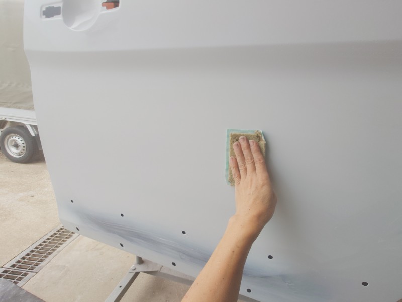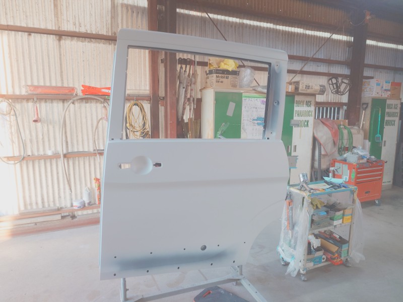 新品ドアも足付けを行いサフェーサー塗装を始めました。