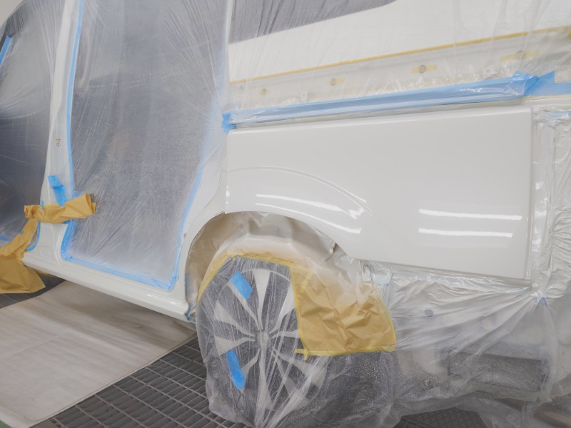 リアバンパーのマスキングが完了して塗装を行う準備が整いました。