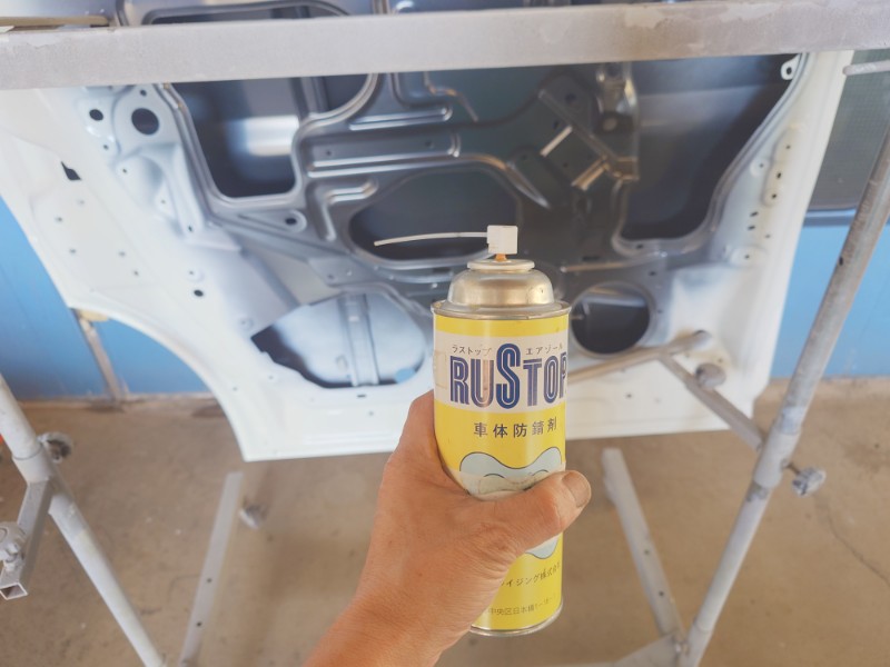 ドアの裏は意外と水が流れるので防錆剤ラストップを新車パネルに近いように吹き付け、たれおちるくらい流し錆の発生を抑制します。