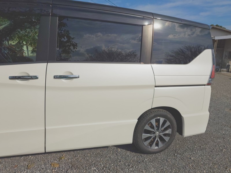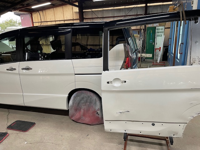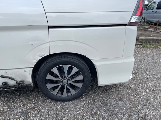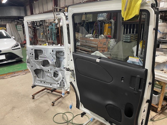 スライドドアは損傷が大きい為、新品ドアパネルへ取替を行い、ロッカーパネル、クオーターとリアバンパーは修理作業にて進めます。