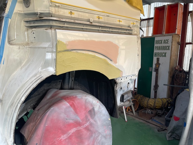各種当て板を使用してパテの整形研磨を行いサフェーサーを塗装する作業に移りました。