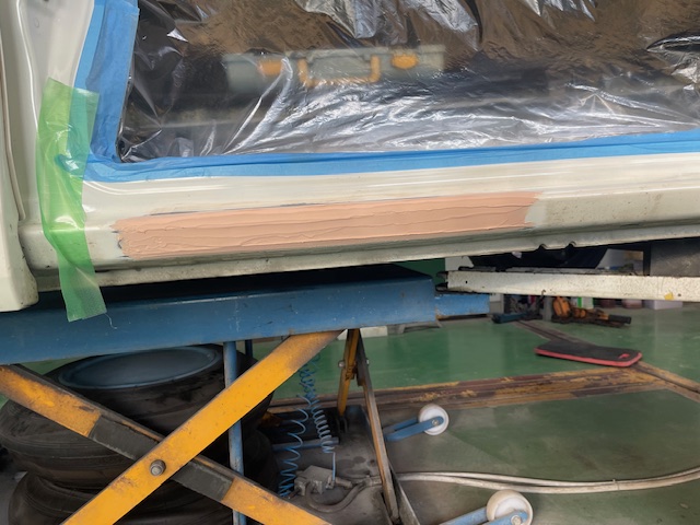 ロッカーパネルも鈑金を行いパテ作業にかかります。