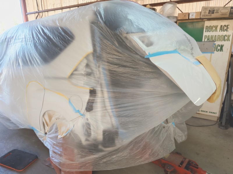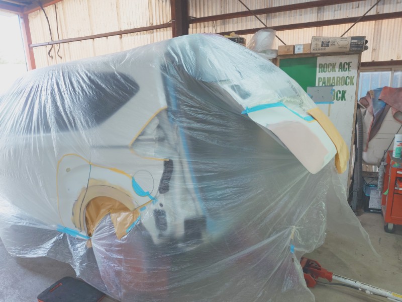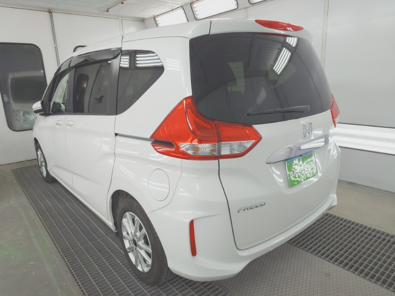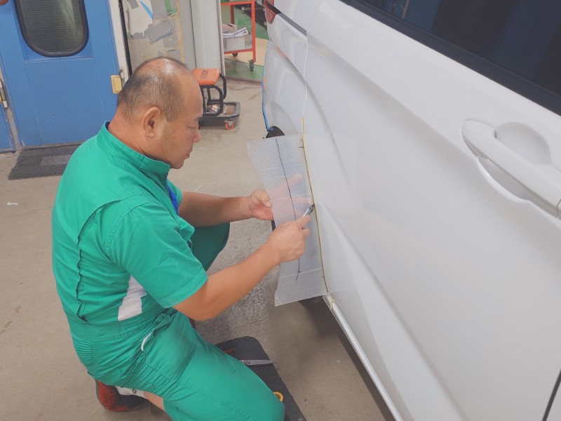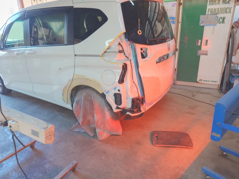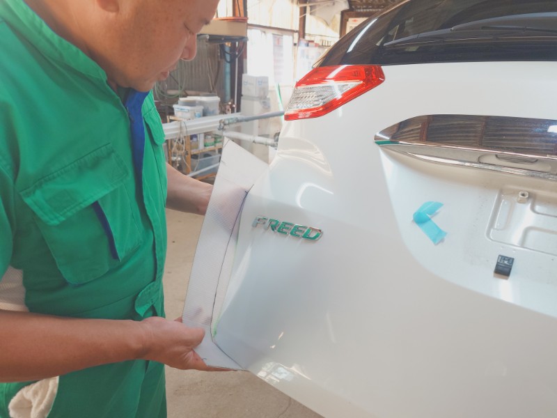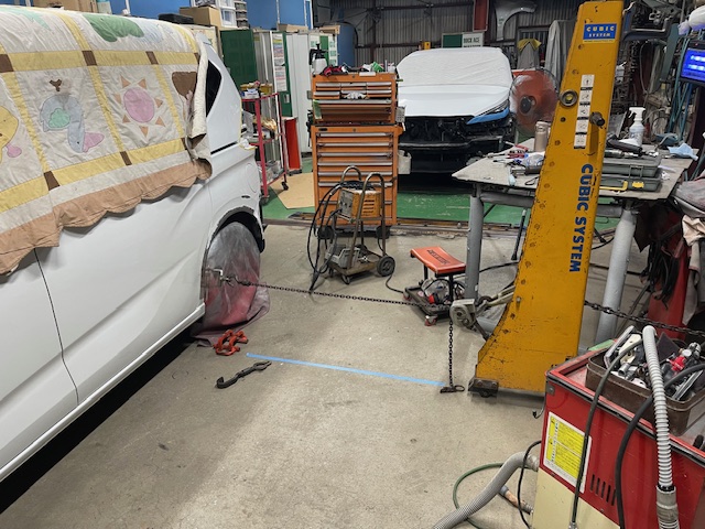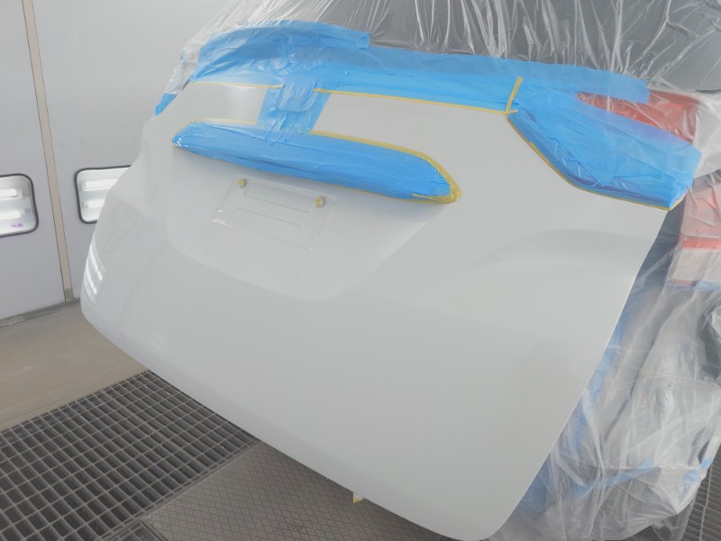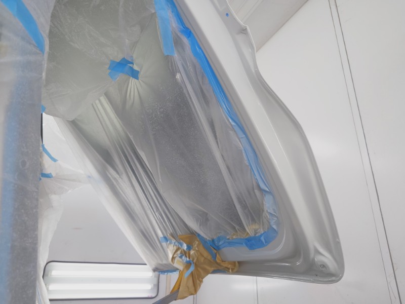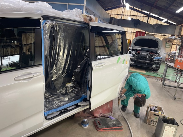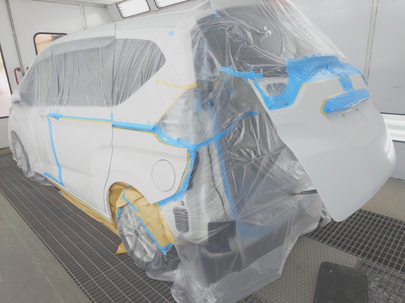 パテの粉や溶剤臭が入らないようにスライドドアとバックドア開口部にノーポリを使用して養生を行い異臭が残りにくい作業を心がけています。