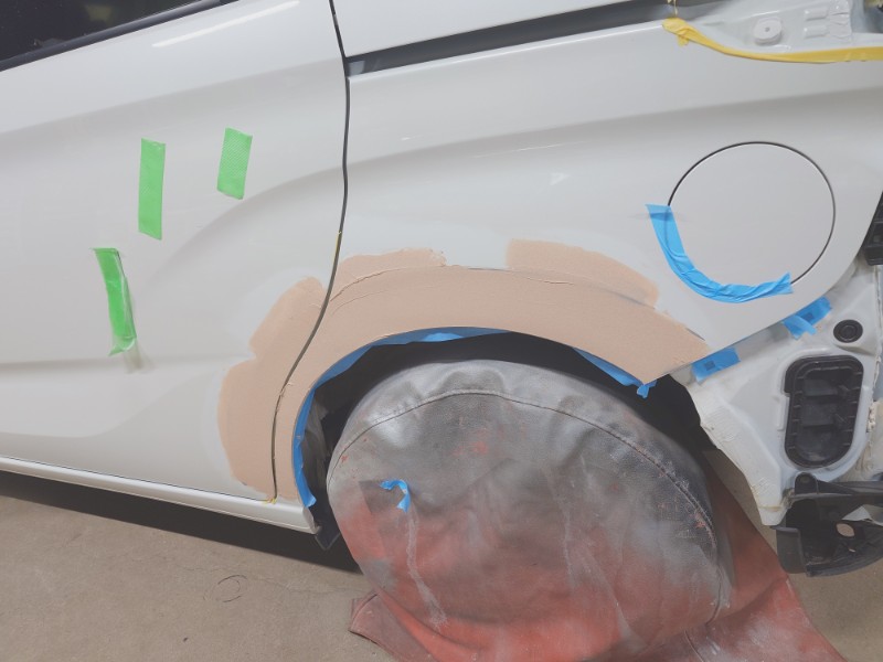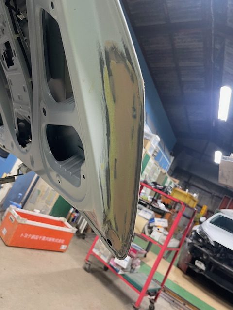 塗膜の段差を取り、ドアトクオーターパネルもパテ作業に移りました。