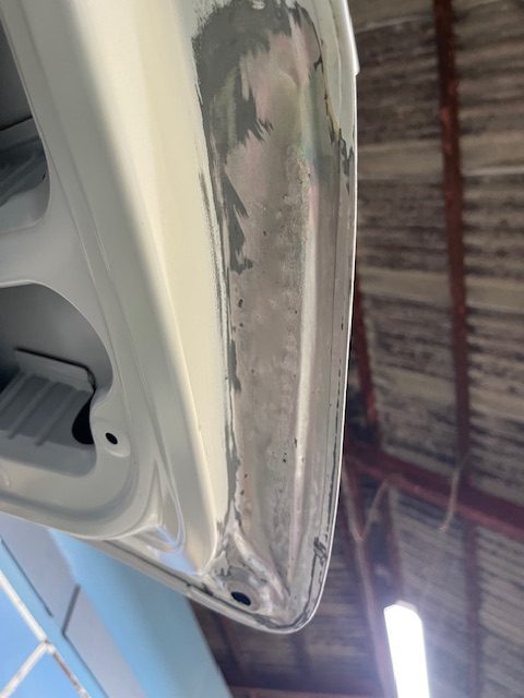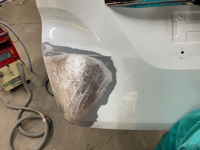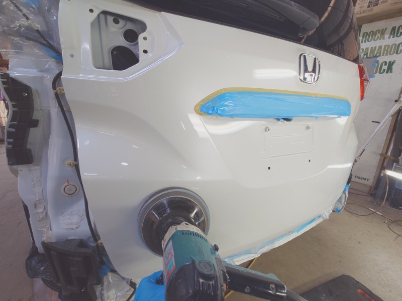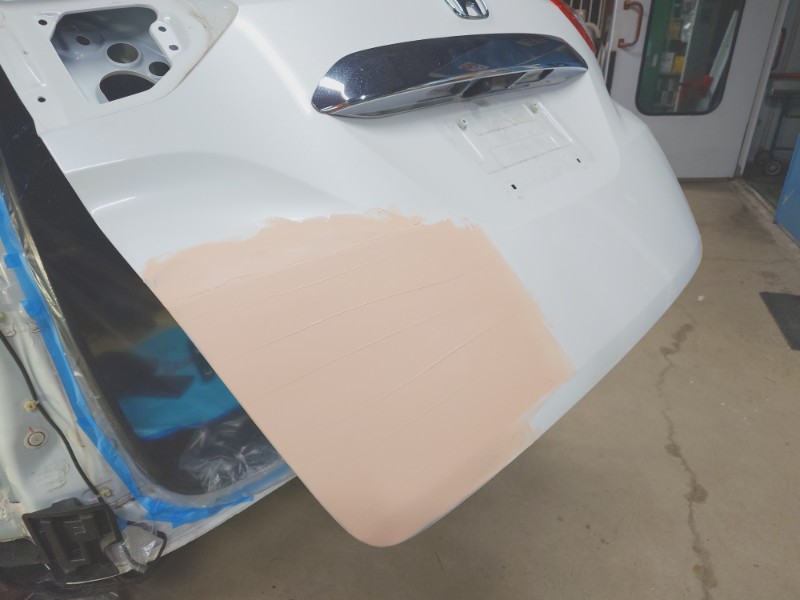 バックドアの鈑金整形が整いサンダーで剥離した塗膜のキワを滑らかに研磨を行いフェザーエッジを作った所でパテ作業に移ります。