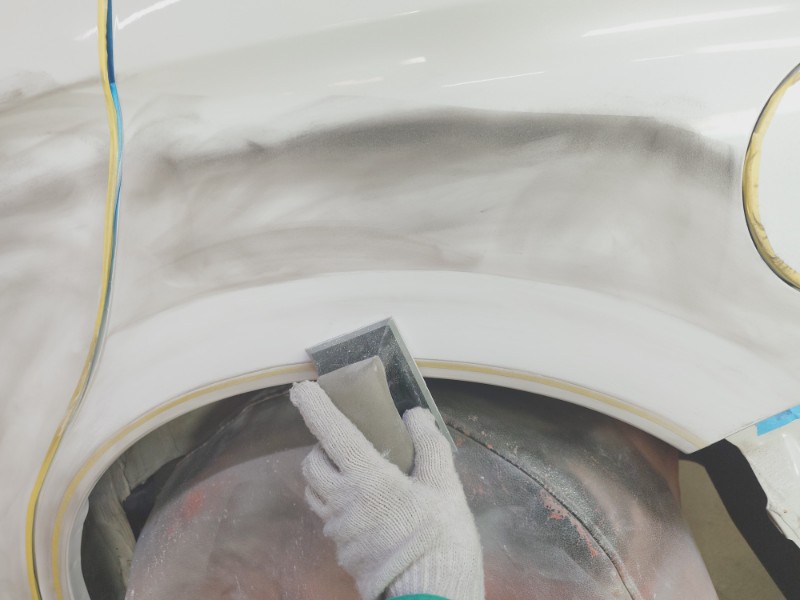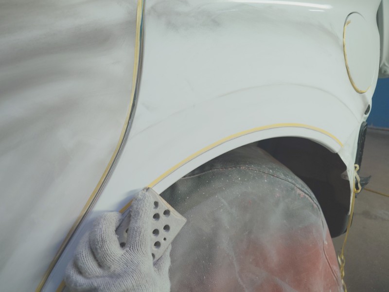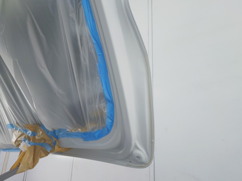 サフェーサーを研磨した後に、足付け研磨とマスキングを行い塗装作業にかかります。