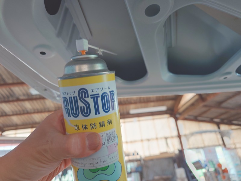リアゲートのヘミング部(鉄板の折り返し部分)も損傷があったので折り返し部には念入りに防錆剤のラストップを吹き付けています。