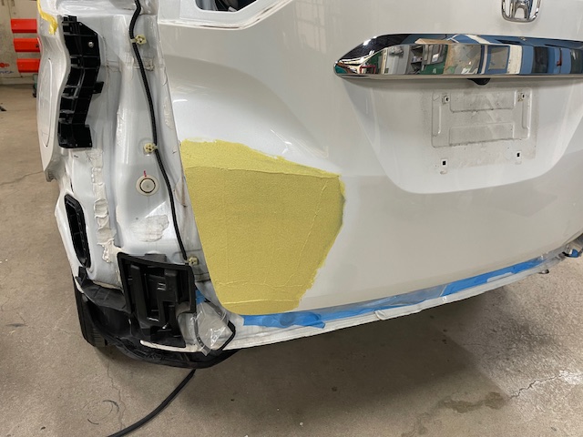 パテの周辺部に足付け研磨を行いサフェーサー塗装のマスキングが完了しました。