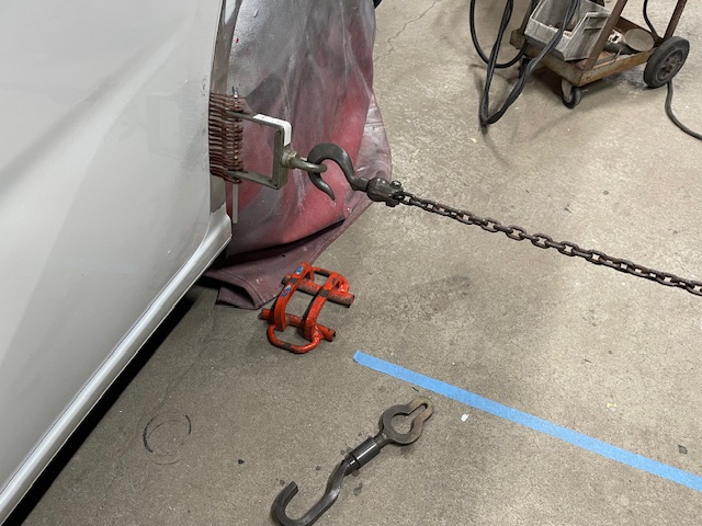 先程、反対側で作った形状のゲージを使用してドア後部の成型を行ってからフレーム修正機のタワーでロックピラーの引き出し作業にかかります。