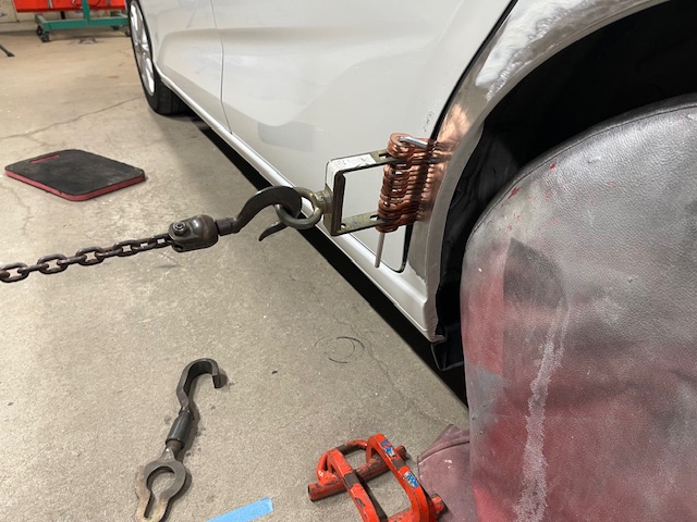ホイールハウス周辺の損傷にスタッド引きを行い鉄板面が整ってきました。
