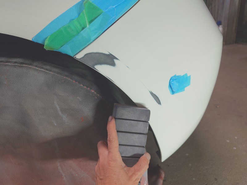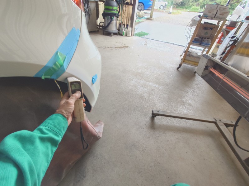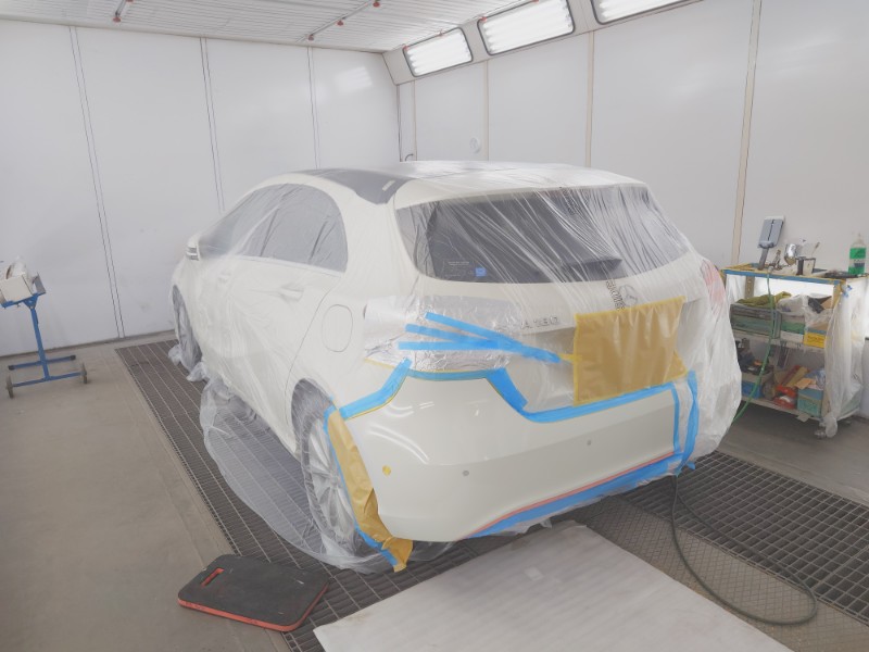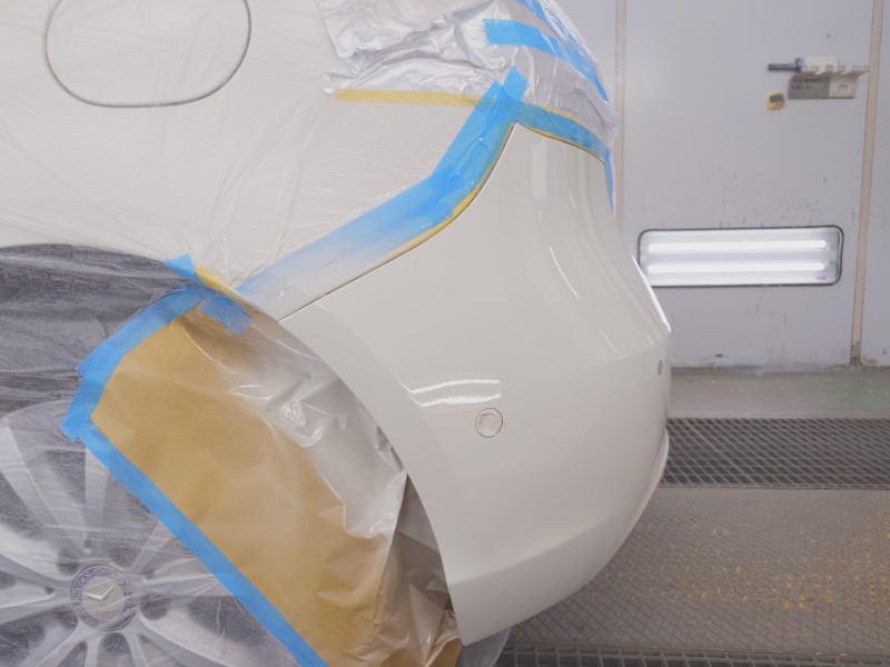 シリコンオフを使用した脱脂を行い、樹脂プライマ塗布後に柔軟性のある樹脂仕様の二液型サフェーサーを塗装しています。