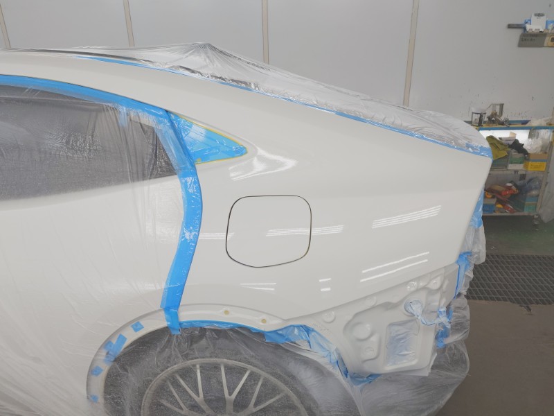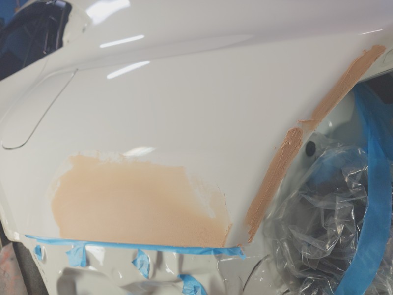 加熱が不十分な場合は、パテやサフェーサーが痩せたり、後から揮発したガスが塗膜の中に閉じ込められてトラブルの原因になる場合があるので、電気式のヒーターを使用してサフェーサーの硬化反応を進め溶剤分も出来るだけ排出させています。