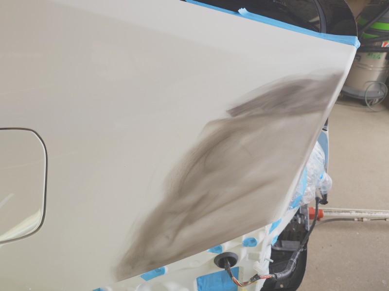 黒い粉のガイドコートを塗り、ゆがみを点検しながらサフェーサーを研磨していきました。