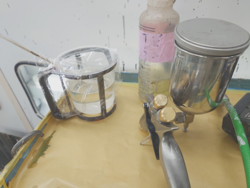 パネル全体にクリアーコートを行う為,日本ペイント製GLクリアーの配合を行いクリアー塗装の準備が完了しました。