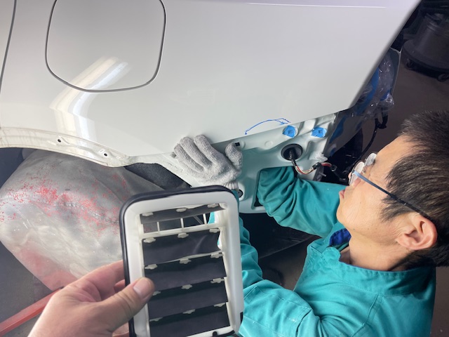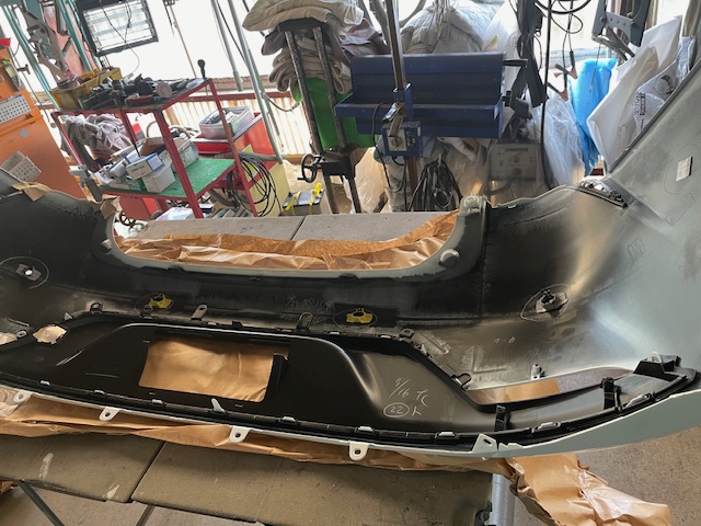 新品のリアバンパーを取り付けるため、もとのリアバンパーから損傷の無い部品を新しいバンパーフェースに組替を行っています。