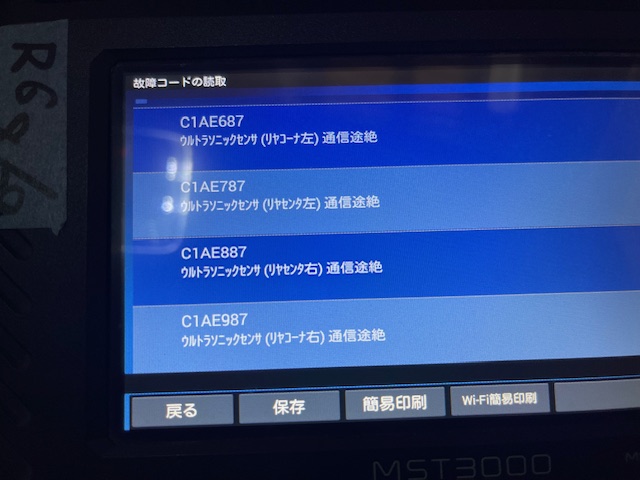 コーナーセンサーに異常が無くてもセンサーのコネクターを外しバンパー脱着を行うと車両コンピューターに履歴が残ってしまう場合があるので、診断機を使用して検出されたすべての故障履歴をリセット致しました。