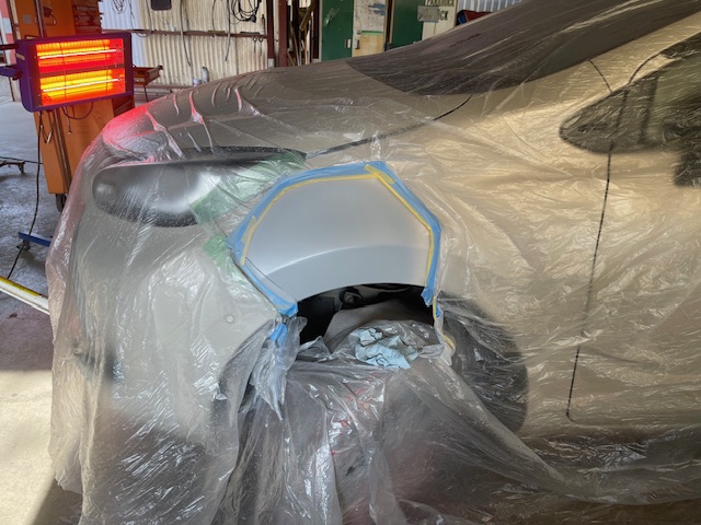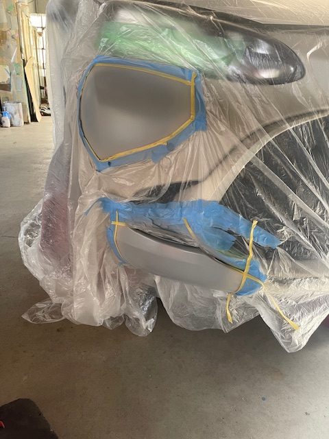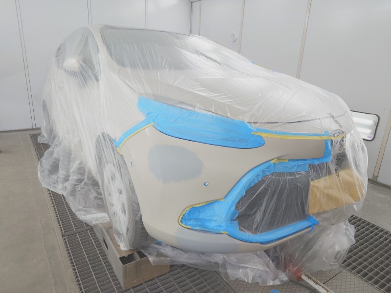 フロントバンパーもシリコンオフによる脱脂を行い素地部にPPプライマーを塗り、サフェーサー塗装の準備が整いました。